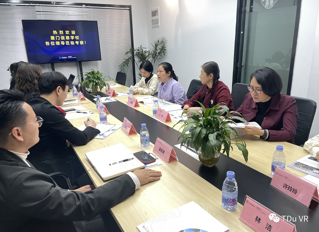 天度股份商务总监王利、商务经理吴锦涛、刘泽伟,产品经理温金凤,教育研究员吴洪鑫等陪同考察。教育研究员首先向厦门信息学校来访的领导表示热烈的欢迎,并全面地介绍了公司的整体业务板块与在智慧教育领域的取得的创新应用成效。随后,来访领导体验了我司虚拟仿真的教学产品以及天度教育云平台在教学数据方面的智能化应用。